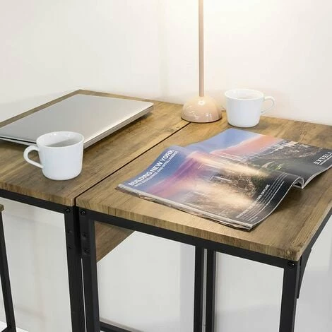 MDF tops with wooden effect. Black powder coated steel frame. Sturdy and durable.