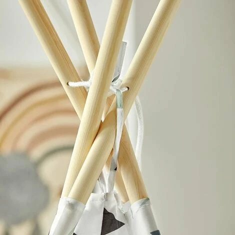 The tent and floor mat are made of polyester & cotton fabric; the poles are made of pine wood.