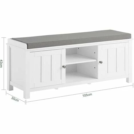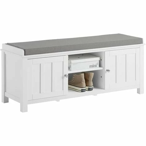 Under the seat, two cubes with doors and storage compartment in middle with adjustable shelf provide large storage space for shoes, etc.